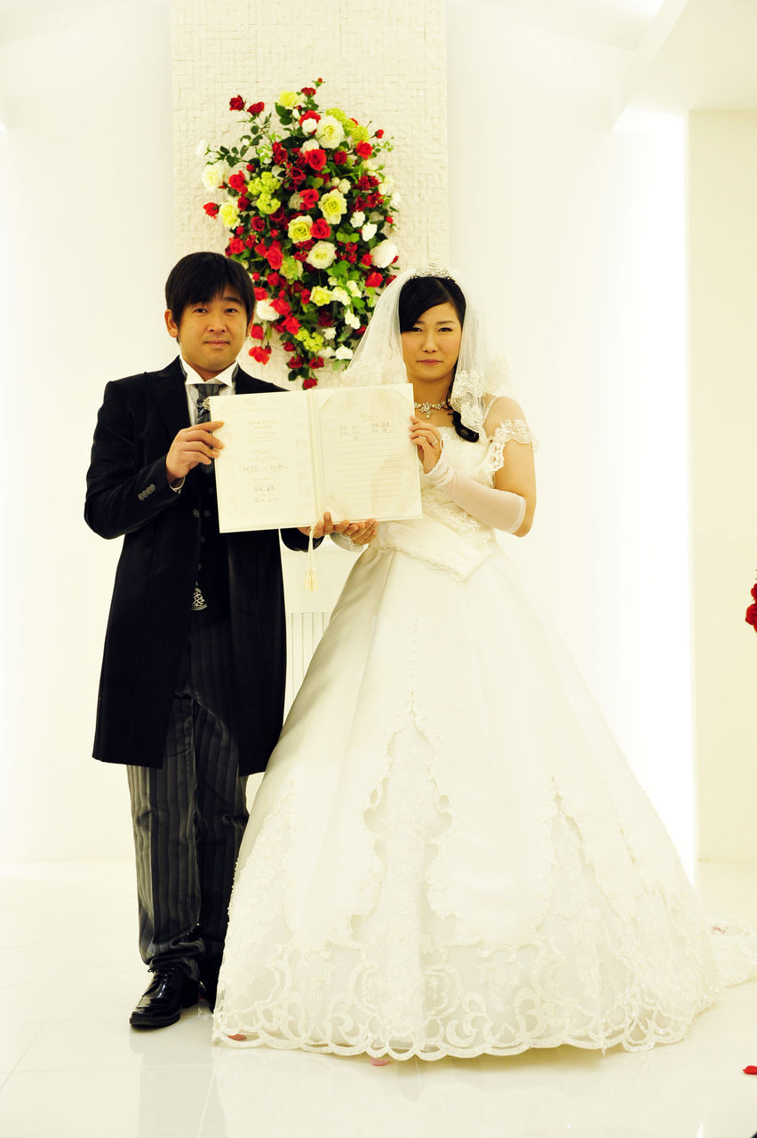 ご婚礼のお衣裳を着て、真っ白な大理石のチャペル等で