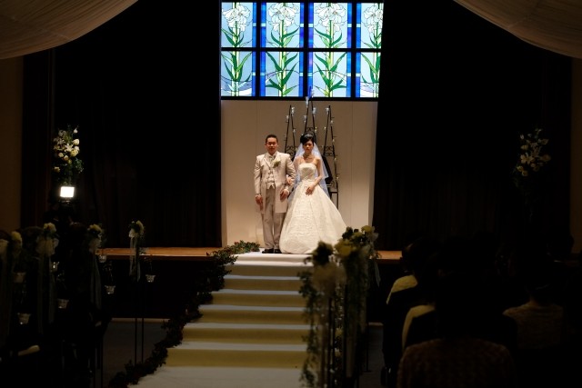 お二人で腕を組み、ステージ上まで続くバージンロードを歩く姿はとても綺麗で見とれてしまいました。