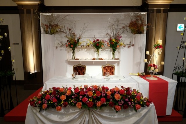 衣裳以外にも、新郎新婦のお2人が座る高砂席の後ろのお花が