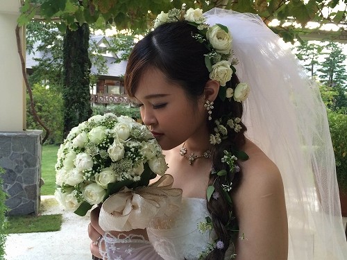 さらに新婦役のヘッド装花とブーケが白いバラだったので、白を基調とする会場との